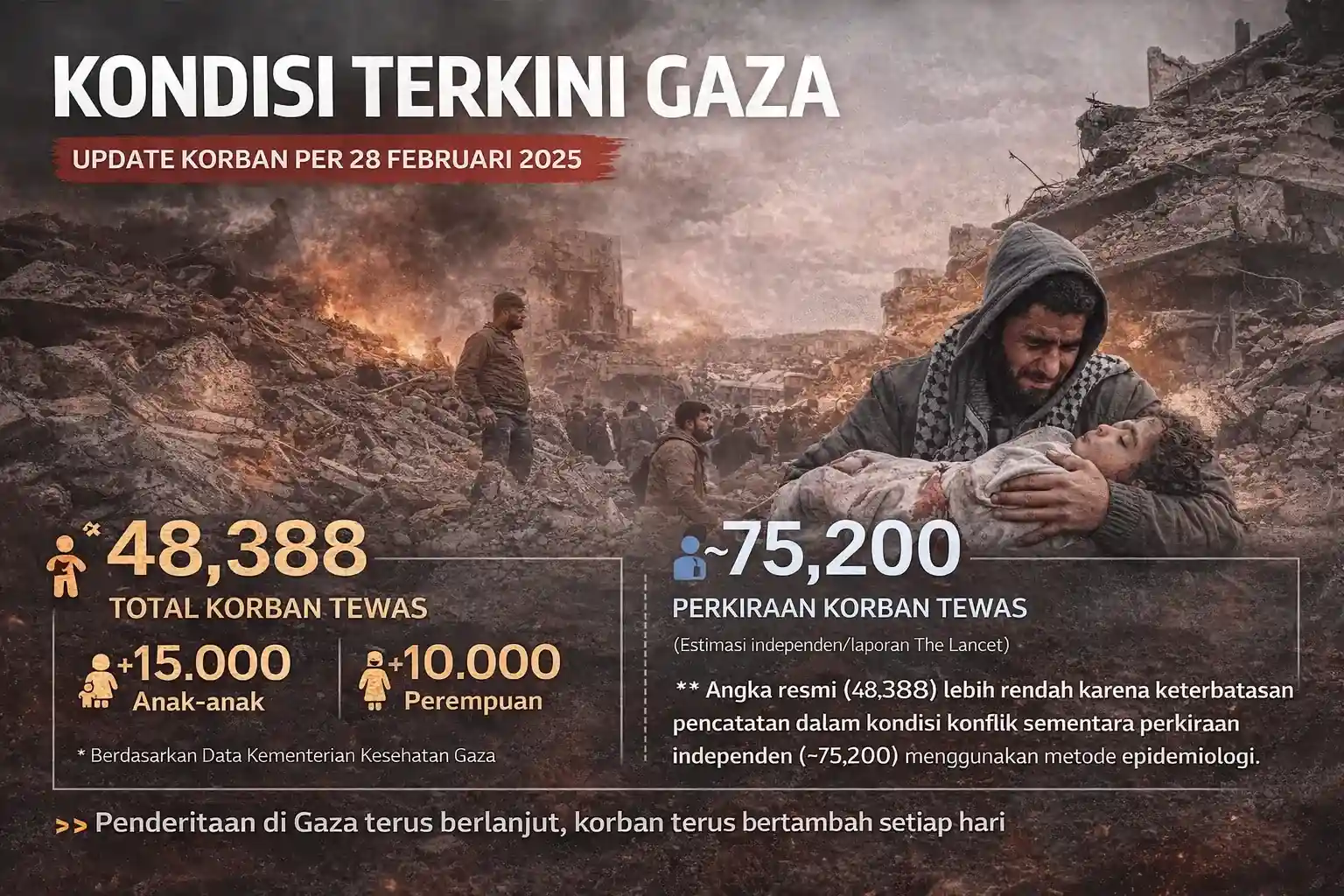 Sejak 7 Oktober 2023, konflik berkepanjangan telah menyebabkan puluhan ribu korban jiwa dan menghancurkan sebagian besar wilayah Gaza. Ribuan keluarga kehilangan rumah. Banyak anak kehilangan ayah dan ibunya. Akses pangan sangat terbatas, distribusi bantuan sering terhambat, dan harga kebutuhan pokok melonjak drastis.